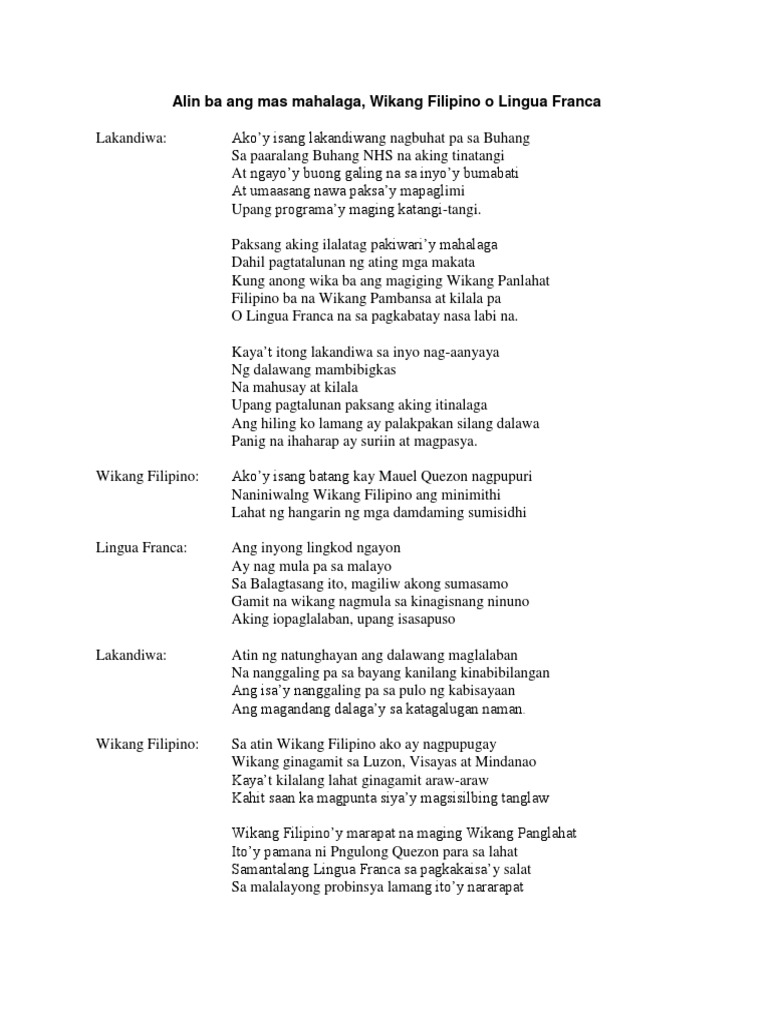Alin Ang Mas Mahalaga Wikang Filipino O Wikang Ingles Balagtasan
