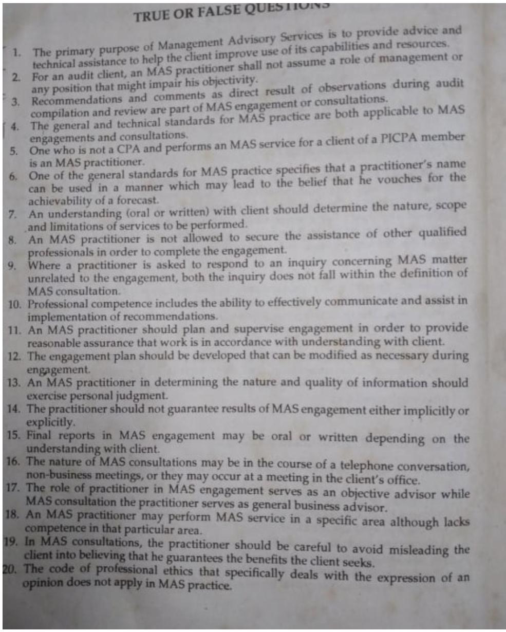 Audits are only designed to test the validity of the financial statements and that only. Documentation is not as essential in an MAS engagement as it is in an audit engagement. In general tax planning and advising are not included with the tax preparation fees.