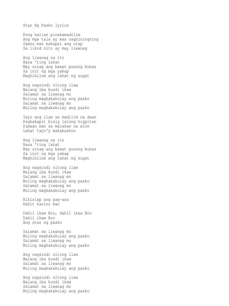Kung kailan pinakamadilim Ang mga tala ay mas nagniningning Gaano man kakapal ang ulap Sa likod nito ay may liwanag Ang liwanag na itoy nasa ting lahat May sinag ang bawat pusong bukas Sa init ng mga yakap Maghihilom ang lahat ng sugat Ang nagsindi nitong ilaw Walang iba kundi ikaw Salamat sa liwanag mo Muling magkakakulay ang pasko Salamat. Lyrics to Star Ng Pasko by KAPAMILYA STARS. Kung kailan pinakamadilim Ang mga tala ay mas nagniningning Gaano man kakapal ang ulap Sa likod nito ay may liwanag.